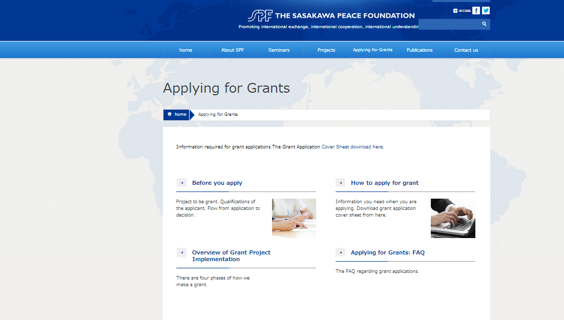 Para inscribirse los participantes deben completar el formulario disponible online en inglés, con una descripción del proyecto (hasta cinco páginas). Todos estos documentos deben ser enviados por correo a la siguiente dirección:General Affairs Department, The Sasakawa Peace FoundationThe Nippon Foundation Bldg., 4th Fl.1-2-2, Akasaka, Minato-ku, Tokyo 107-8523, JapanPara consultas sobre la postulación, utilizar el formulario de contacto disponible online.Para mayor información, visitar: Fondo de la Fundación Sasakawa Peace