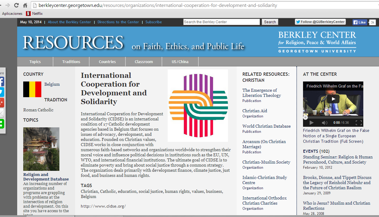International Cooperation for Development and Solidarity (CIDSE) is an international coalition of 17 Catholic development agencies based in Belgium that focuses on issues of advocacy, development, and education. Founded on Christian values, CIDSE works in close conjunction with numerous faith-based networks and organizations worldwide to strengthen their moral voice and influence political decisions in institutions such as the EU, UN, WTO, and international financial institutions. The ultimate goal of CIDSE is to eliminate poverty and bring about social justice through a common strategy. The organization deals primarily with development finance, climate justice, just food, and business and human rights.