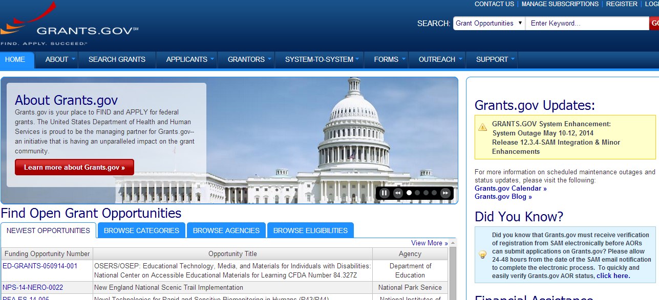 Note: New applicants must register to grants.gov through 5-steps (obtain a Data Universal Number [DUNS], Register the Organization with the System for Awards Management (SAM), Obtain Username and Password, AOR authorization, and track AOR status). Registration may take up to 2 weeks, so begin the registration process as soon as possible.