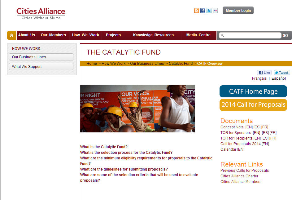 The Catalytic Fund (CATF) is a Cities Alliance global funding instrument which provides grant support for innovative projects that strengthen and promote the role of cities in poverty reduction and in sustainable urban development.
