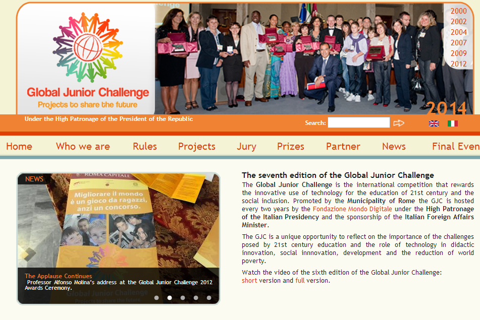 The Global Junior Challenge is the international competition that rewards the innovative use of technology for the education of 21st century and the social inclusion. Promoted by the Municipality of Rome the GJC is hosted every two years by the Fondazione Mondo Digitale under the High Patronage of the Italian Presidency and the sponsorship of the Italian Foreign Affairs Minister.