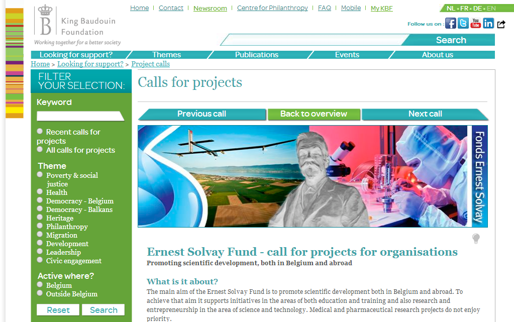 La Fundación Rey Badouin tiene abierta la convocatoria para el Fondo Ernest Solvay cuyo objetivo es promover el desarrollo científico, tanto en Bélgica como en el extranjero. La fecha de cierre es el 12 de noviembre de 2014.