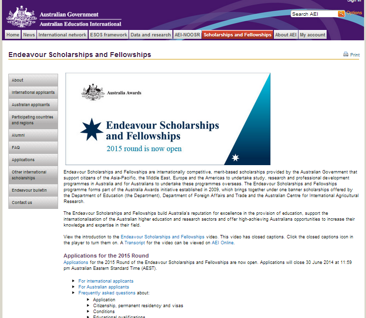 El Gobierno de Australia tiene abierta su convocatoria Endeavour Scholarships y Fellowships cuyo objetivo principal es crear lazos entre ciudadanos del mundo y Australia, a partir de becas de estudio, investigación o desarrollo profesional. La fecha de cierre es el 30 de junio de 2014.