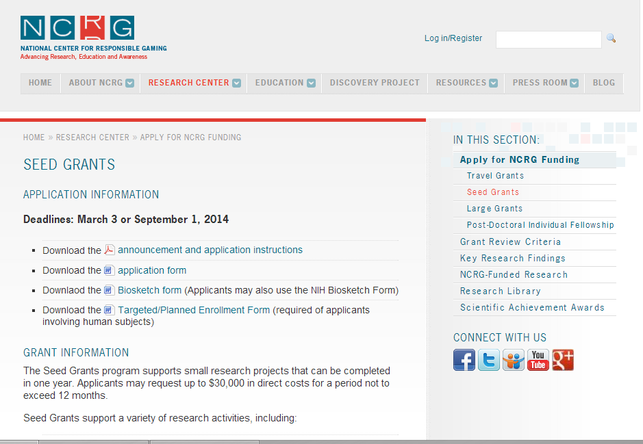 El Centro Nacional para el Juego Responsable (NCRG, por sus siglas en inglés) invita a organizaciones sociales a presentar propuestas de investigación sobre trastornos del juego. El objetivo del programa es aumentar la comprensión sobre que tiene la patología en los juegos de azar en la juventud, y encontrar métodos eficaces de tratamiento para este trastorno. La fecha de cierre es el 1 de septiembre de 2014.