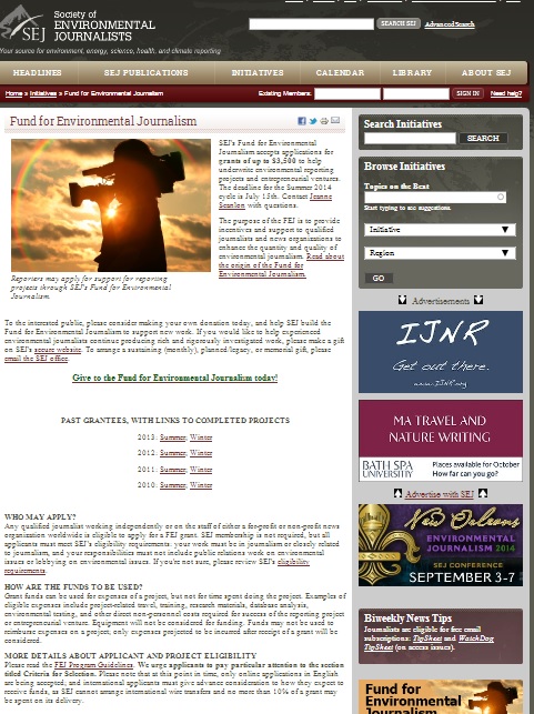 La Sociedad de Periodistas Ambientales (SEJ, por sus siglas en inglés) tiene abierta la convocatoria para el Fondo de Periodismo Ambiental cuyo objetivo principal es financiar proyectos de investigación ambientales, e iniciativas empresariales. La fecha de cierre es el 15 de julio de 2014.