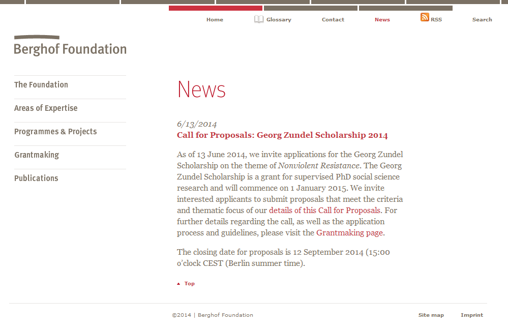 La Fundación Berghof tiene abierta la convocatoria de Propuestas para la Beca Georg Zundel 2014 sobre Resistencia sin Violencia, cuyo objetivo principal es financiar doctorados en ciencias sociales con enfoque en resolución de conflictos y consolidación de paz. La fecha de cierre es el 12 de septiembre de 2014, 15.00 CEST.