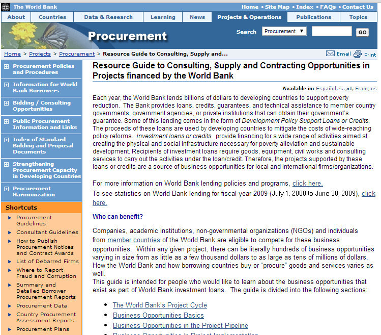 Companies, academic institutions, non-governmental organizations (NGOs) and individuals from member countries of the World Bank are eligible to compete for these business opportunities. Within any given project, there can be literally hundreds of business opportunities varying in size from as little as a few thousand dollars to as large as tens of millions of dollars. How the World Bank and how borrowing countries buy or “procure” goods and services varies as well.