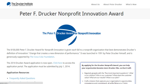 Drucker Institute de Claremont Graduate University tiene abierta la convocatoria para el Premio Peter F. Drucker para Innovación Sin Fines de Lucro, cuyo objetivo principal es apoyar proyectos innovadores de organizaciones no lucrativas, para reconocer y celebrar su ejemplo, e inspirar a otros. La fecha de cierre es el 1 de julio de 2014.