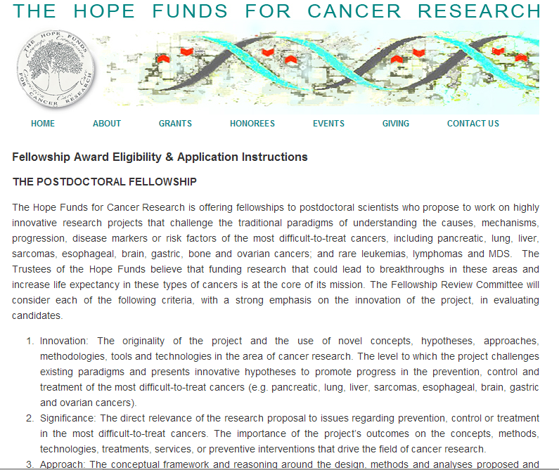 The Hope Funds for Cancer Research is offering fellowships to postdoctoral scientists who propose to work on highly innovative research projects that challenge the traditional paradigms of understanding the causes, mechanisms, progression, disease markers or risk factors of the most difficult-to-treat cancers, including pancreatic, lung, liver, sarcomas, esophageal, brain, gastric, bone and ovarian cancers; and rare leukemias, lymphomas and MDS. The Trustees of the Hope Funds believe that funding research that could lead to breakthroughs in these areas and increase life expectancy in these types of cancers is at the core of its mission. The Fellowship Review Committee will consider each of the following criteria, with a strong emphasis on the innovation of the project, in evaluating candidates.