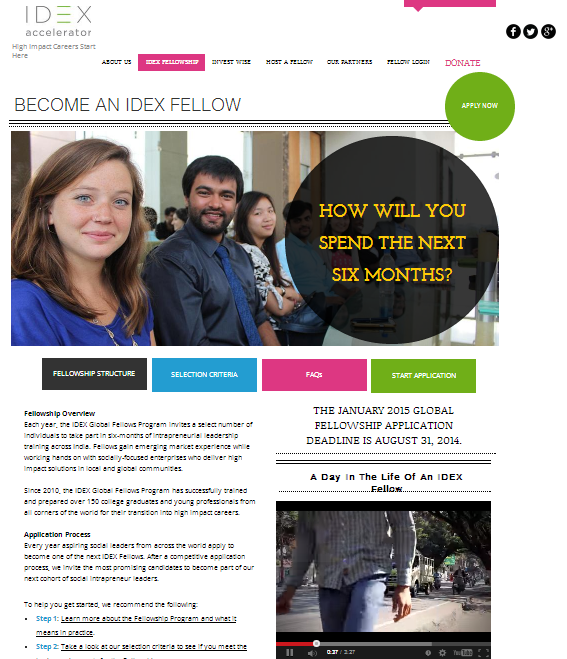 IDEX Accelerator, en alianza con Gray Matters Capital Foundation tiene abierta la convocatoria para su Programa Global de Fellowships IDEX cuyo objetivo principal brindar la posibilidad de trabajar en emprendimientos relacionados con soluciones de alto impacto social en comunidades locales y globales. La fecha de cierre es el 31 de agosto de 2014.