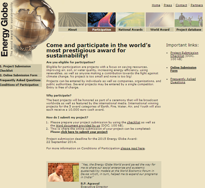 Exceptional sustainable projects from all around the world are invited for the Energy Globe Awards 2015. Projects focusing on the conservation of resources, the improvement of air and water quality, the efficient use of energy, the implementation of renewable energies as well as creating a heightened awareness for these important areas are being accepted by the Energy Globe Foundation for the International Award. The foundation also yearly organizes Energy Globe National Awards.