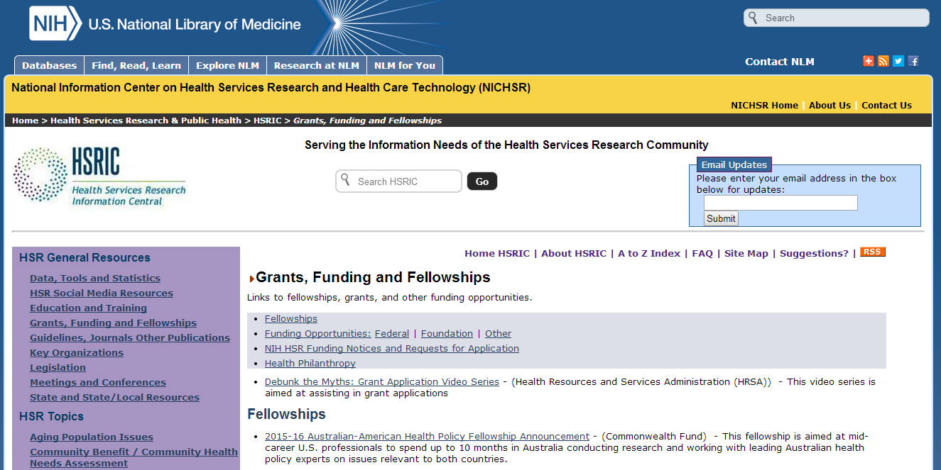 National Institutes of Health Grants and Funding Opportunities – Extensive information about grants, research funding, and policies. Please scroll to bottom of Grants and Funding page for specific information on NIH HSR Funding Opportunities, PAs and RFAs.
