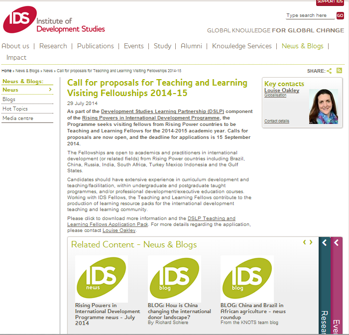 As part of the Development Studies Learning Partnership (DSLP) component of the Rising Powers in International Development Programme, the Programme seeks visiting fellows from Rising Power countries to be Teaching and Learning Fellows for the 2014-2015 academic year. Calls for proposals are now open, and the deadline for applications is 15 September 2014.