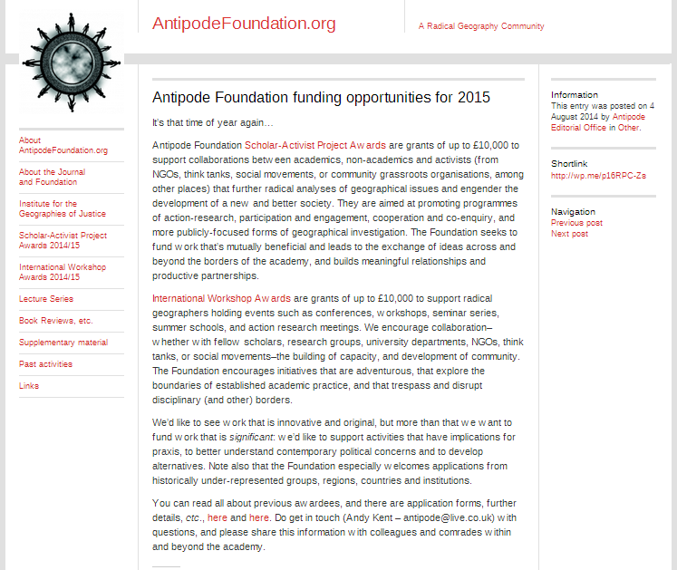 For more information, please visit Antipode Foundation funding opportunities for 2015.