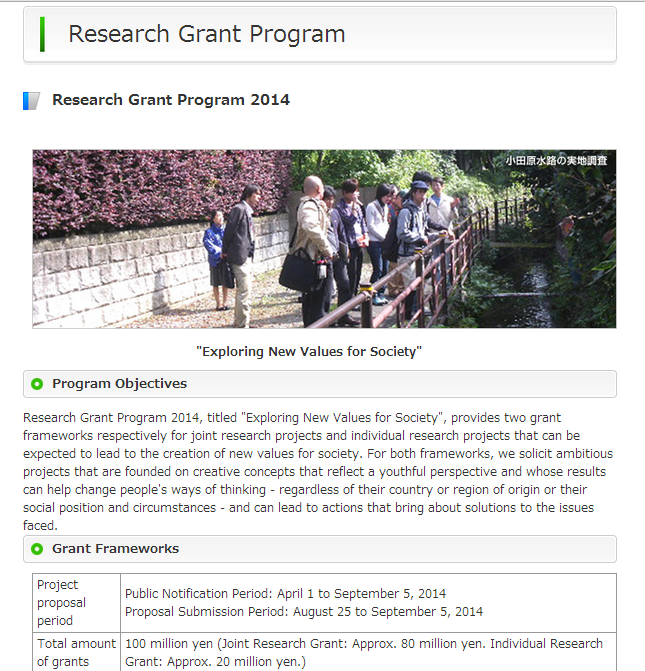 Individual Research Projects carried out by individuals – Up to around 1 million yen for projects spanning one (1) year and up to around 2 million yen for projects spanning 2 years. Total allocated grant amount is approximately 20 million yen.
