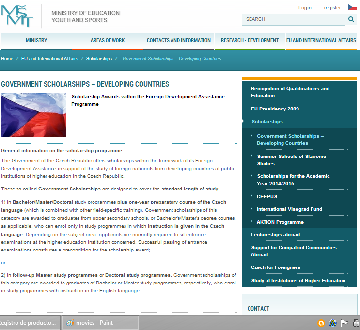 General information on the scholarship programme:The Government of the Czech Republic offers scholarships within the framework of its Foreign Development Assistance in support of the study of foreign nationals from developing countries at public institutions of higher education in the Czech Republic. These so called Government Scholarships are designed to cover the standard length of study: 1) in Bachelor/Master/Doctoral study programmes plus one-year preparatory course of the Czech language (which is combined with other field-specific training). Government scholarships of this category are awarded to graduates from upper secondary schools, or Bachelor’s/Master’s degree courses, as applicable, who can enrol only in study programmes in which instruction is given in the Czech language. Depending on the subject area, applicants are normally required to sit entrance examinations at the higher education institution concerned. Successful passing of entrance examinations constitutes a precondition for the scholarship award;or 2) in follow-up Master study programmes or Doctoral study programmes. Government scholarships of this category are awarded to graduates of Bachelor or Master study programmes, respectively, who enrol in study programmes with instruction in the English language.