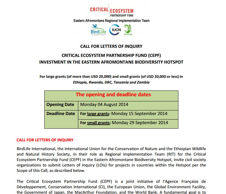 The Critical Ecosystem Partnership Fund (CEPF) Eastern Afromontane Regional Implementation Team invites civil society organizations to submit Letters of Inquiry (LOIs) to implement projects with large grants (more than USD20,000) and small grants (USD20,000 or less) in Ethiopia, Rwanda, DRC, Tanzania and Zambia.