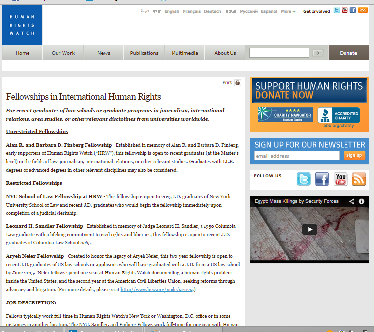 NYU School of Law Fellowship at HRW – This fellowship is open to 2015 J.D. graduates of New York University School of Law and recent J.D. graduates who would begin the fellowship immediately upon completion of a judicial clerkship.