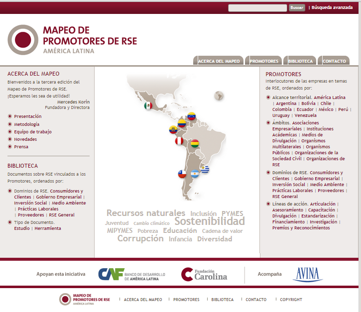 El Mapeo de Promotores de Responsabilidad Social Empresarial en América Latina es una iniciativa independiente de investigación, sistematización, comparación, análisis y difusión de información sobre aquellas organizaciones que trabajan de modo sostenido en diálogo con las empresas para difundir e implementar una cultura de gestión responsable, abordando la RSE de un modo integral o desde uno o varios de sus dominios.