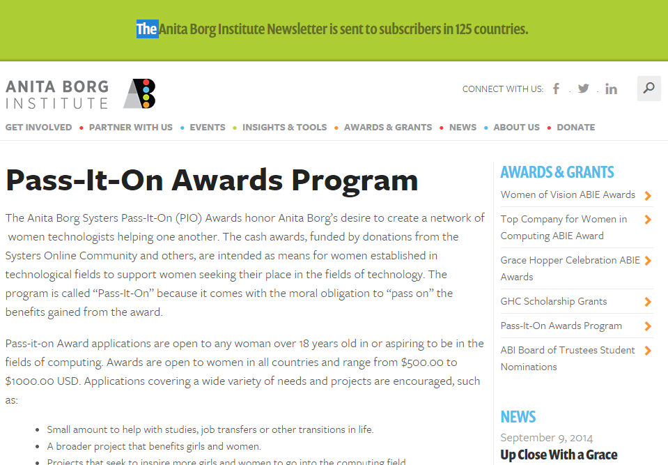 The Anita Borg Systers Pass-It-On (PIO) Awards honor Anita Borg’s desire to create a network of women technologists helping one another. The cash awards, funded by donations from the Systers Online Community and others, are intended as means for women established in technological fields to support women seeking their place in the fields of technology. The program is called “Pass-It-On” because it comes with the moral obligation to “pass on” the benefits gained from the award.
