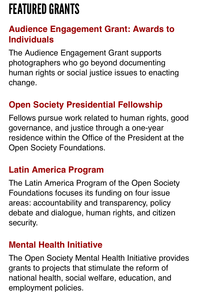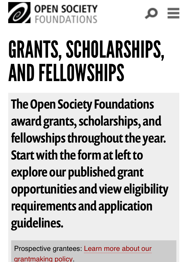 The Open Society Foundations award grants, scholarships, and fellowships throughout the year. Start with the form at left to explore our published grant opportunities and view eligibility requirements and application guidelines.