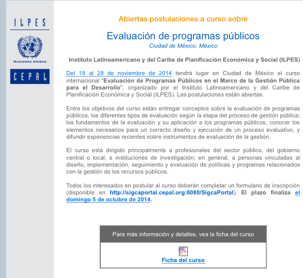 septiembre 16, 2014 Fabiana Abiertas postulaciones a curso sobre evaluación de programas públicos If you enjoyed this article, please consider sharing it! Haz clic para compartir en Facebook (Se abre en una ventana nueva) Facebook Haz clic para compartir en X (Se abre en una ventana nueva) X Más Haz clic para compartir en LinkedIn (Se abre en una ventana nueva) LinkedIn Haz clic para compartir en Reddit (Se abre en una ventana nueva) Reddit Haz clic para compartir en Pinterest (Se abre en una ventana nueva) Pinterest Me gusta Cargando... Relacionado