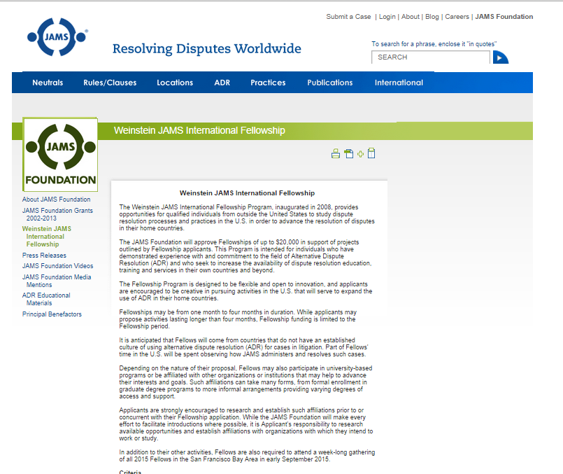 The JAMS Foundation will approve Fellowships of up to $20,000 in support of projects outlined by Fellowship applicants. This Program is intended for individuals who have demonstrated experience with and commitment to the field of Alternative Dispute Resolution (ADR) and who seek to increase the availability of dispute resolution education, training and services in their own countries and beyond.