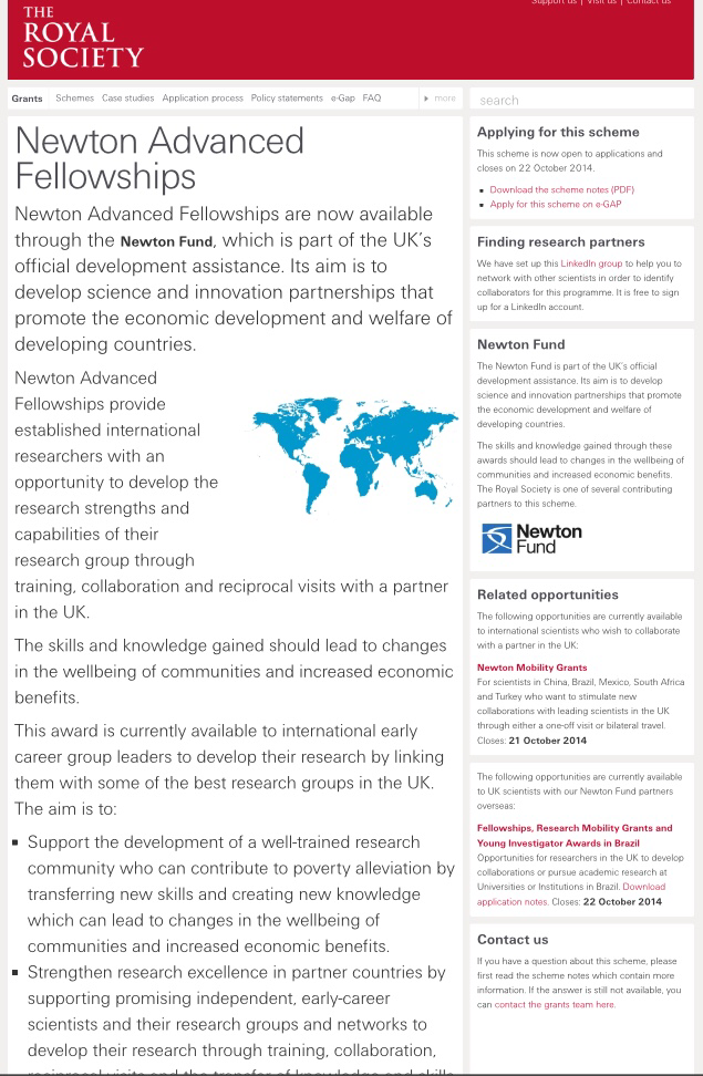 Newton Advanced Fellowships are now available through the Newton Fund, which is part of the UK’s official development assistance. Its aim is to develop science and innovation partnerships that promote the economic development and welfare of developing countries.