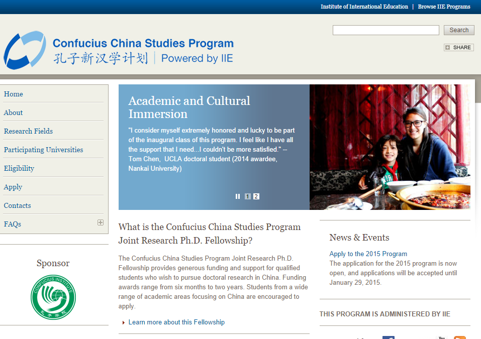 El Instituto de Estudios Internacionales (IIE, por sus siglas en inglés) tiene abierta la convocatoria para el Programa de Estudios Confucio en China, cuyo objetivo principal es fomentar el interés y apoyar estudios relacionados con China en la comunidad académica internacional. La fecha de cierre es el 29 de enero de 2015.