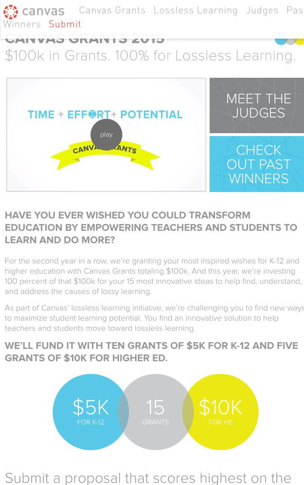 For the second year in a row, we’re granting your most inspired wishes for K-12 and higher education with Canvas Grants totaling $100k. And this year, we’re investing 100 percent of that $100k for your 15 most innovative ideas to help find, understand, and address the causes of lossy learning.