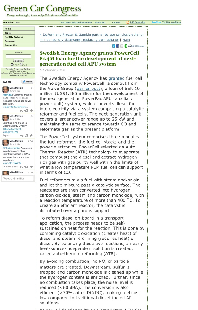 Listed below are links to weblogs that reference Swedish Energy Agency grants PowerCell $1.4M loan for the development of next-generation fuel cell APU system: