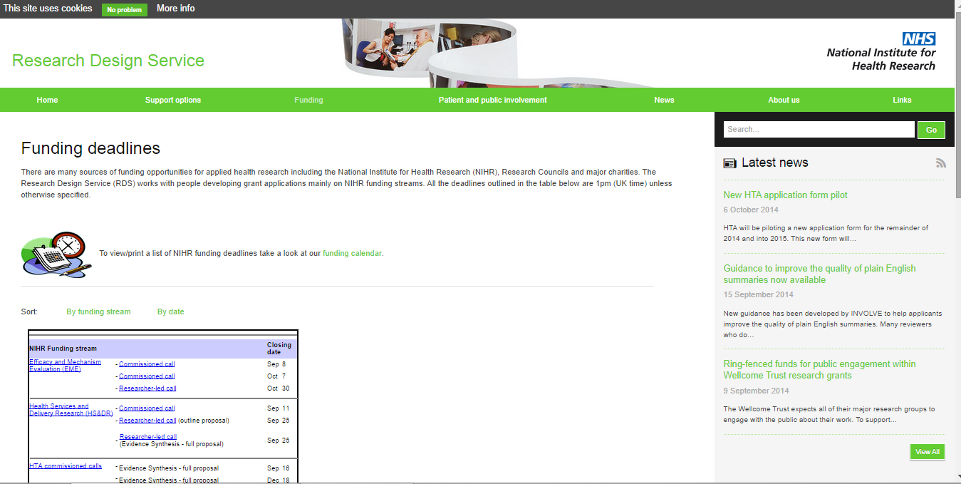 The NIHR issues calls for funding for different programmes throughout the year. We post the details of these calls on this website. For a general overview of all funding streams from the NIHR, please see the table hosted by the national RDS website.