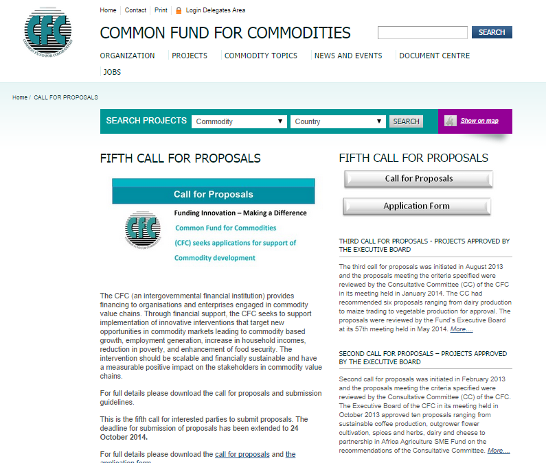 Common Fund for Commodities (CFC) tiene abierta la convocatoria para apoyar el desarrollo de productos básicos cuyo objetivo principal es la implementación de intervenciones innovadoras, dirigidas a nuevas oportunidades en los mercados de productos básicos que conducen al crecimiento, generación de empleo, aumento de los ingresos de los hogares, la reducción de la pobreza, y la mejora de la seguridad alimentaria. La fecha de cierre es el 24 de octubre de 2014.