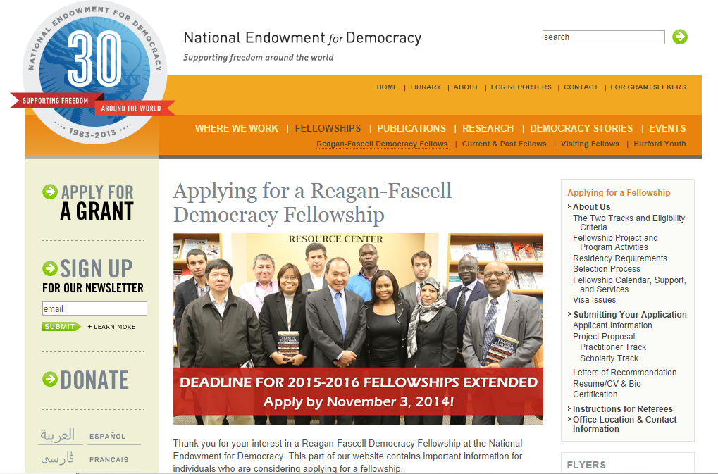 National Endowment for Democracy (NED) tiene abierta la convocatoria para el programa de Fellowships Reagan-Fascell Democracy, cuyo objetivo principal es apoyar a proyectos de profesionales e investigadores sobre el desarrollo de la democracia. La fecha de cierre es el 03 de noviembre de 2015.