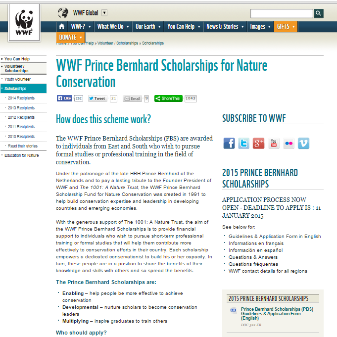 The Prince Bernhard Scholar will then receive a PBS Certificate and is invited to join the WWF Volunteer, Intern & Prince Bernhard Scholar Alumni group on Facebook.