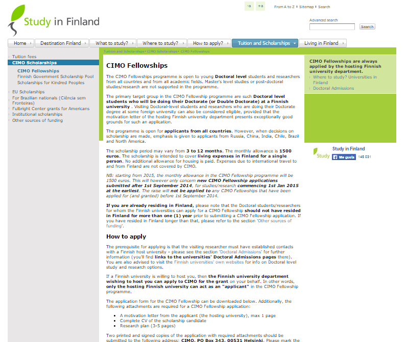 NB: starting from 2015, the monthly allowance in the CIMO Fellowship programme will be 1500 euros. This will however only concern new CIMO Fellowship applications submitted after 1st September 2014, for studies/research commencing 1st Jan 2015 at the earliest. The raise will not be applied to any CIMO Fellowships that have been applied for (and granted) before 1st September 2014.
